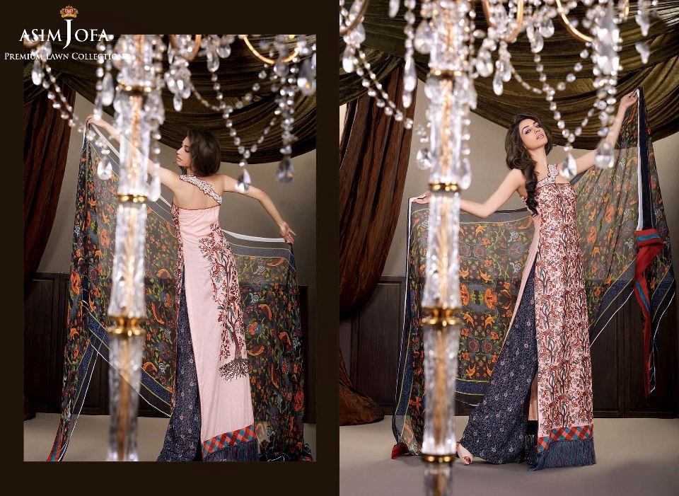 One of my favorite soothing shade of sea green, Candy pink and Navy blue introduced in Asim Jofa premium lawn collection 2013 embellished with pearl dust print front with Blue embroidered panels, Border and candy pink back, A sore eyes Design exclusively merged with printed pant and Silk Dupatta.