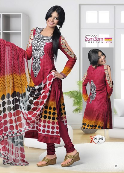 ZamZam chiffon lawn is the part of Dawood textiles Summer collection 2013-2014, Zam Zam Lawn 2013 inclue75 latest prints of lawn fabric.The Dresses include in This lawn magazine 2013 stitched in Cultural Shalwar kameez style and have fusion prints on neck lines and Shirt tail, Base of fabric printed with the method of fusing Technique that look more pretty.ZamZam lawn 2013 retail price is just 1100 Pakistani Rupee for a raw material and if you are going to buy a stitched piece then it cost 2100 rupee of Pakistan.Zam-Zam lawn collection 2013 Follow 4 piece dressing trend which include Cotton printed Kameez, Chiffon Dopatta with printing, Cotton dyed shalwar and Chiffon printed sleeves so total 8.5 meters fabrics So get new distinction in print design and feel it definitely adds modern value to your wardrobe.